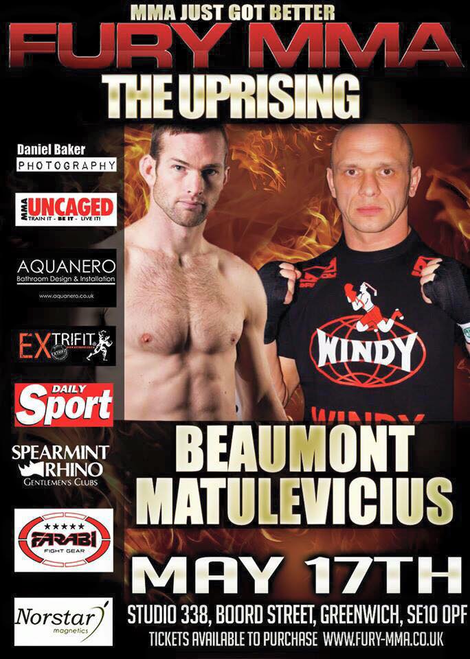 FURY MMA – The Uprising, returns on May 17th at Studio 338, headlined by Bill Beaumont who faces Tomas Matuelvicius in a Pro Welterweight showdown and Krzysztof Wegrynyowski who faces Domanic Dillon in a Featherweight Title Fight showdown.